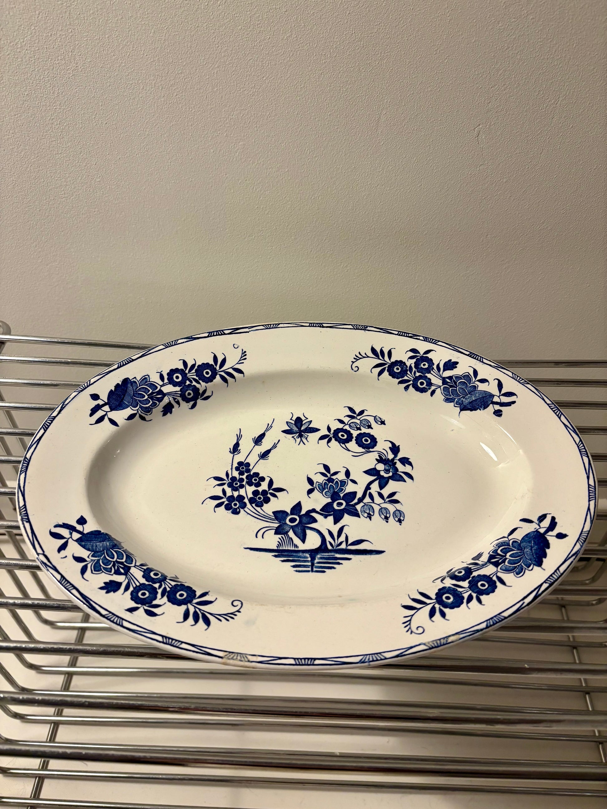 Superbe plat ovale ancien en faïence provenant de la manufacture Boch Frères La Louvière, décoré du motif bleu Grand Bouquet, l’un des décors emblématiques des années 1920–1930. Ses dimensions généreuses (32 cm de long pour 22,5 cm de large) en font une belle pièce de service, aussi élégante en présentation culinaire qu’en décoration dans une cuisine ou sur un dressoir.