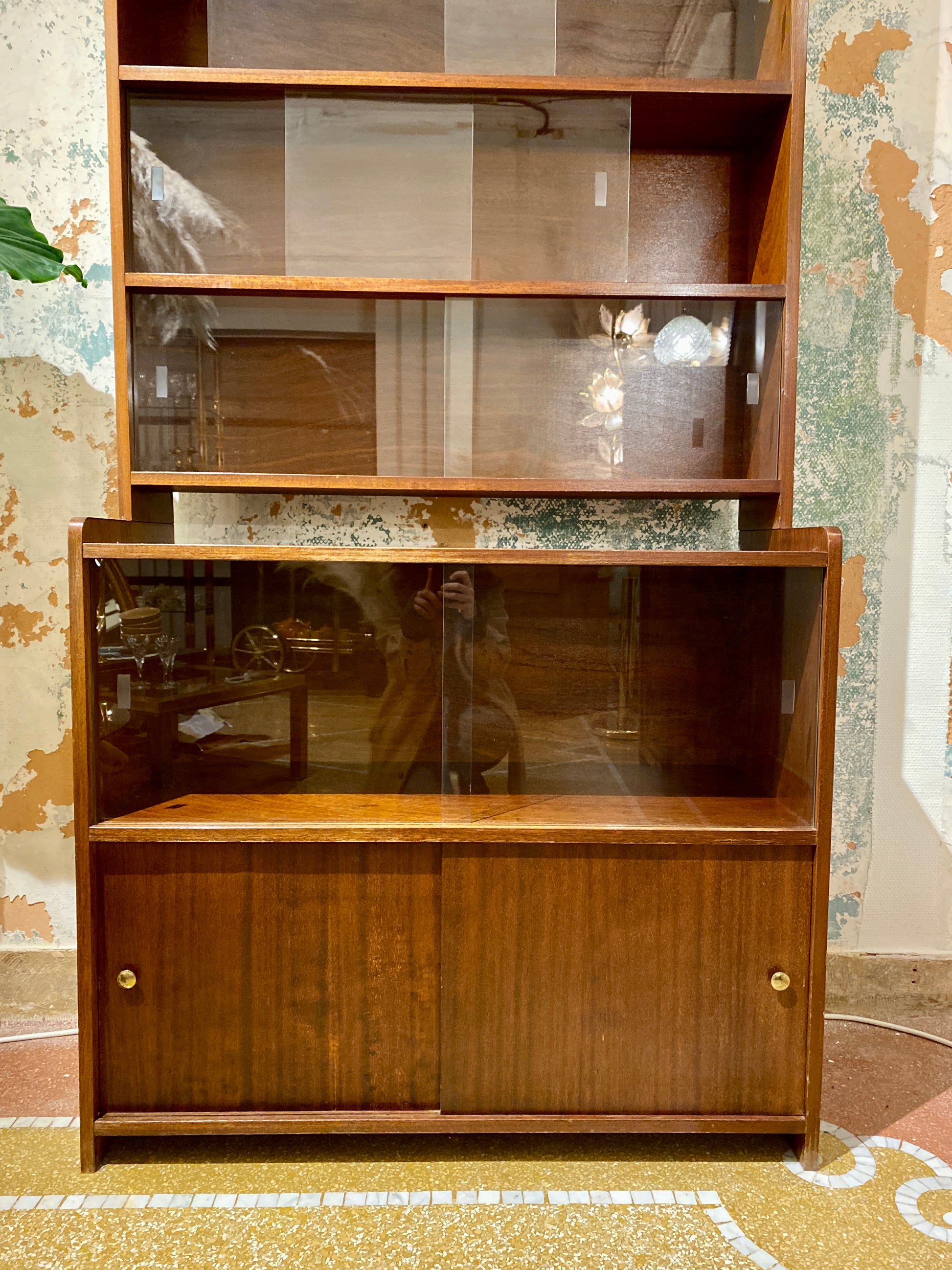 Superbe, pratique et grande bibliothèque/vitrine à deux corps en bois datant des années 70.